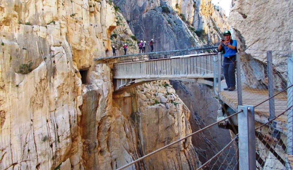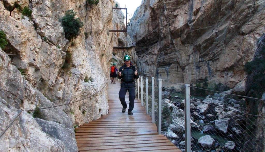 Weiter ins nah gelegene Abdalaijs. Wegen Luftraumverletzungen ist dort ein Flugverbot verhängt worden. Das störte uns nicht, wir könnten ja sowieso nicht fliegen. Wir wollen tauchen. Eintauchen in die Barranca des Caminito del Rey. In El Chorro, am Ausgangspunkt der Schluchtwanderung nimmt uns der Buschauffeur schon gleich alle Hoffnung. Für Wochenende muss man per Internet die Tickets bereits viel im Voraus buchen, sonst hat man null Chancen. Wir gingen trotzdem weiter bis zum Nordportal. Dass Beat dann am Eingang auf drei nette junge Damen aufmerksam wurde, die ausgerechnet 3(!) Tickets, fünf Minuten vor Abmarsch verhöckern wollten, weil deren Freunde nicht dabei sein konnten, das war doch kein Zufall mehr. Mit Helm und „Führer“ haben wir den Trail in 2 Stunden erlebt. Absolut empfehlenswert, siehe Bilder.