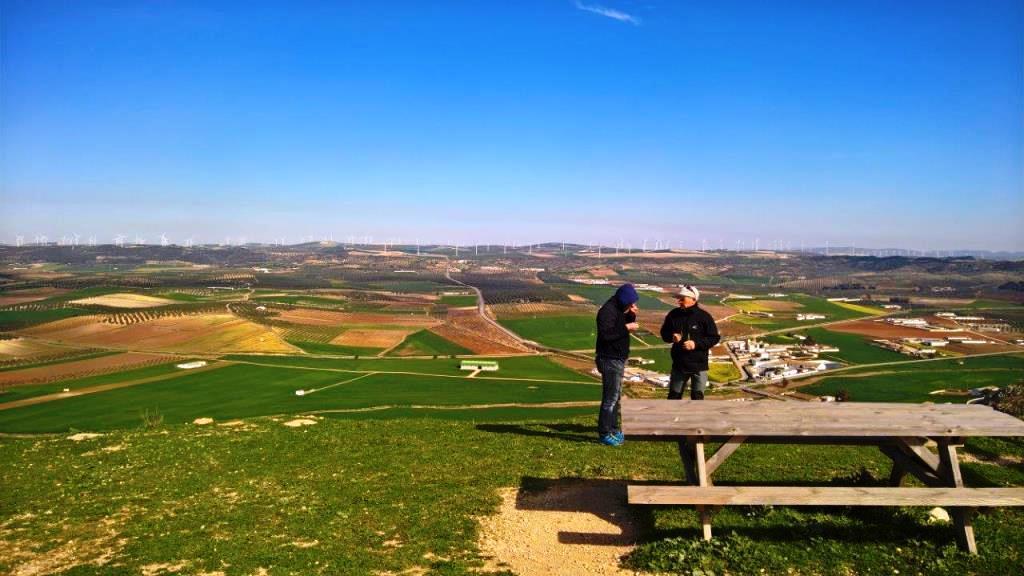 Der Freitagwetterbericht sah an der Küste schlecht aus. Wir flohen ins Landesinnere. Moclin bei Granada. Einen Cortado (spanischer Expresso) im Dörfli selbst und anschliessend kurzer Aufstieg zum Startplatz. Uns zuliebe liess der NO Wind im richtigen Moment nach und die Thermik überwog. Wir stiegen alle schön an die CTR-Grenze des Flughafens Granada. Als wir gesättigt waren, landeten alle neben dem Auto auf der grünen Wiese. Und weils grad so passte, gabs auf dem Weg nach Malaga noch ein Flugstop in Lija, NO Startplatz. Die Sierra Gorda mit den vielen Windrädern machte Eindruck. Ein tolles Fluggebiet. Auf dem Rückflug war das Bergmassiv schön zu sehen, siehe Bild.