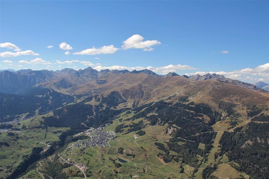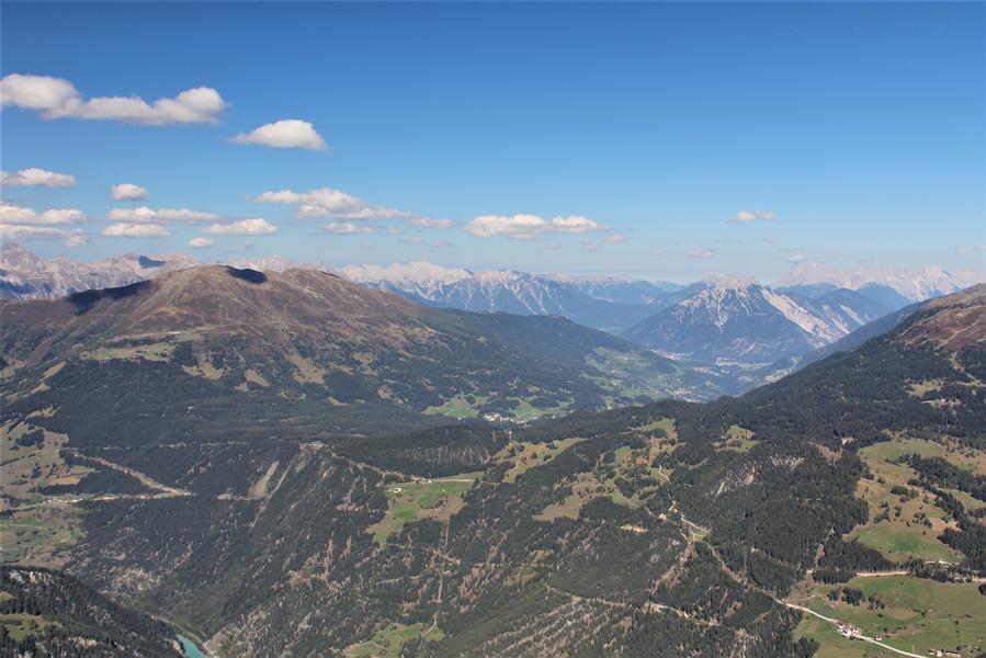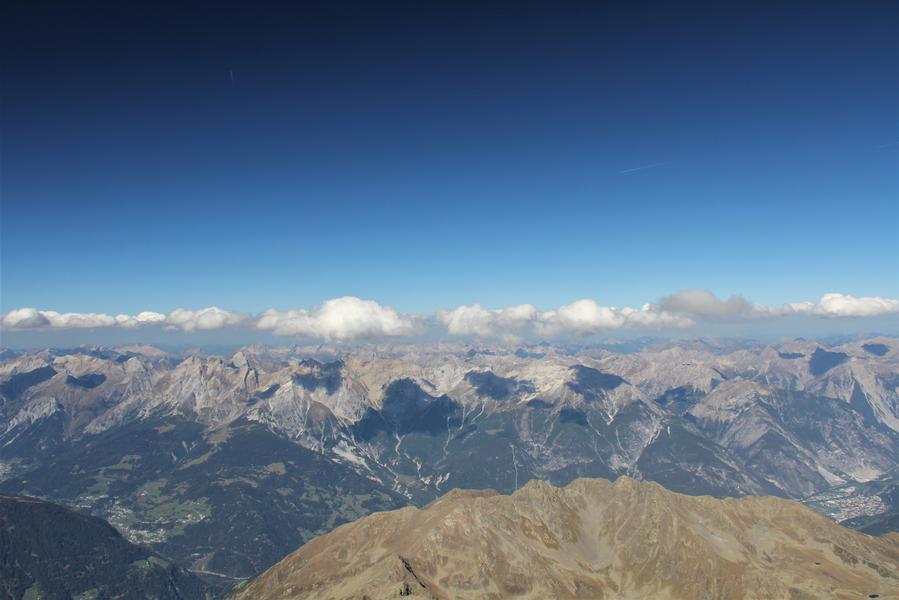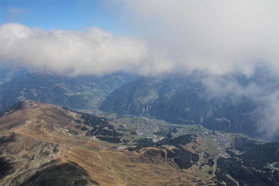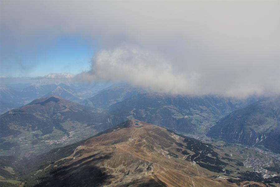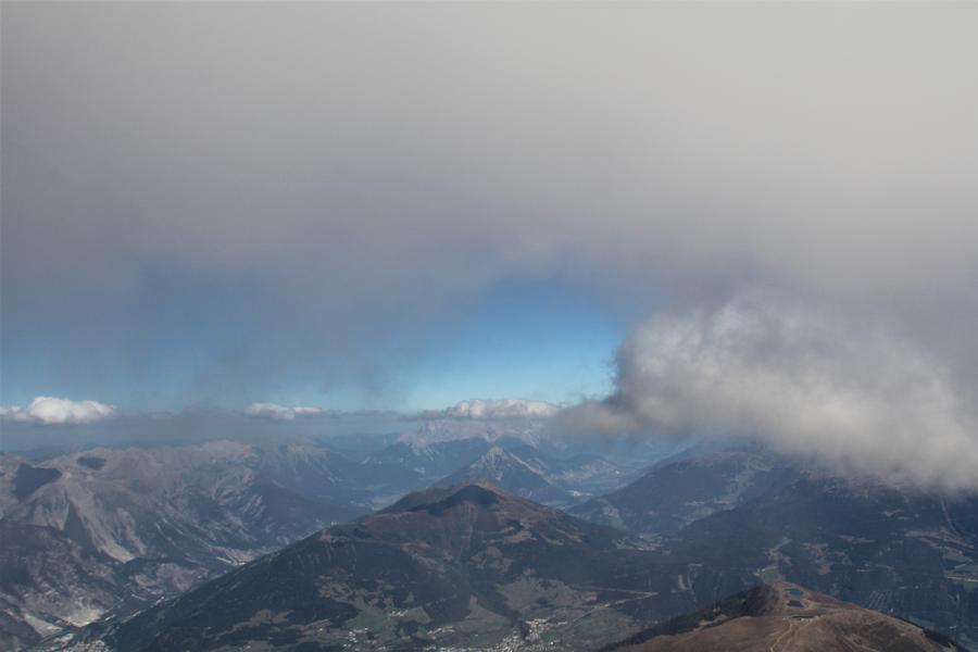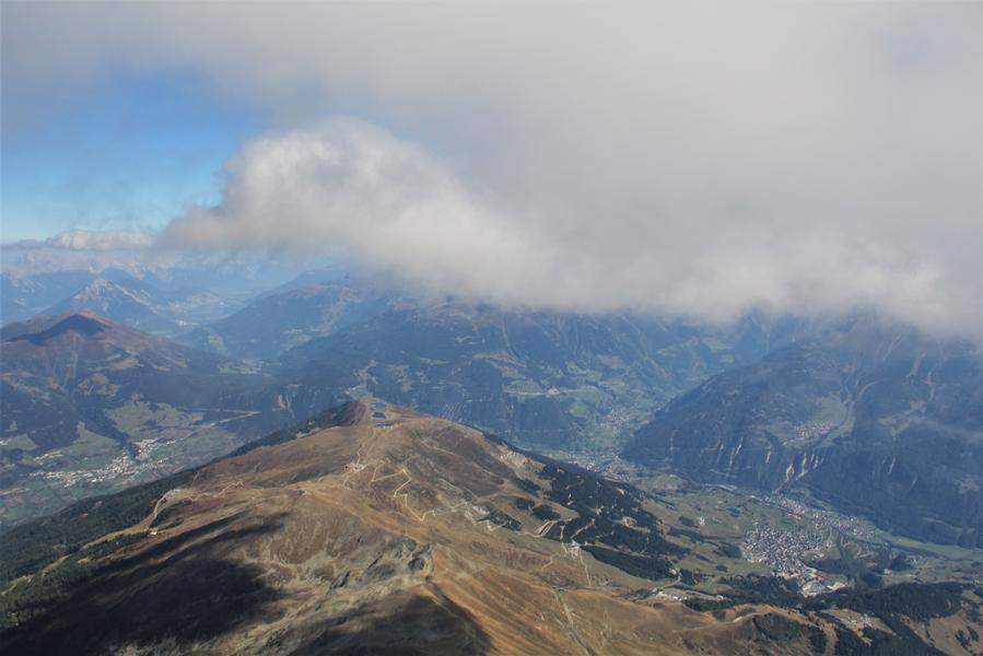 Nun waren wir alle auf den Sonntag gespannt; die Modelle sagten eine Basis von bis zu 3’400 m voraus – kaum zu glauben Ende September. Der Blick am Morgen aus dem Fenster war vielversprechend – ein stahlblauer Himmel lachte uns entgegen, Inversion weggefegt! Nach einem reichlichen Frühstück waren bald alle wieder auf dem Berg. Kurz ein Gruppenfoto und schon waren erste Cumuli am Himmel zu sehen. Und nun kam Bewegung ins Spiel. Der angesagte NW war leicht spürbar; schnell waren alle Schirme am Nordstartplatz ausgelegt. Weil die Sonne auch im Tirol im Süden steht, musste zuerst um den Berg auf die Südost-Seite geflogen werden. Das machte den Einstieg in den Startschlauch nicht einfacher. Einmal überhöht ging es dann aber richtig ab – mit bis zu 4.5 m/s (integriertes Steigen 3/s). Und die Prognosen sollten Recht bekommen – ja sie waren sogar zu pessimistisch. Die Basis war auf 3750 m! Mit den Sommerhandschuhen eine richtige Herausforderung. Die Aussicht unbeschreiblich – dazu verweise ich auf die Bilder in der Galerie. (Anmerkung: weil es sehr labil war, konnte perfekt im Lee geflogen werden – es war kaum bzw. nur auf Kretenhöhe spürbar und absolut save, was uns auch die heimischen Biplace-Piloten bestätigten).