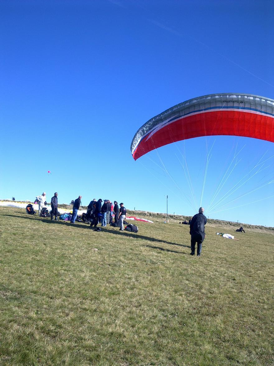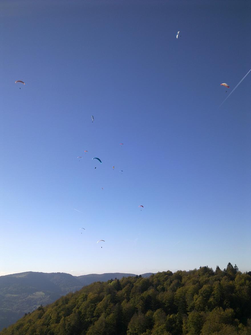 Die Windverhältnisse waren für alle Leistungsstufen beherrschbar. Anfangs war der Höhenwind, Süd/Südwest, noch recht kräftig. Hat aber abgenommen und der Aufwind am Startplatz wurde durch die Thermik optimal. Entsprechen entstand dann ein Gedränge auf dem Startfeld. Zumal auch die Schule mit vielen Schülern anwesend war die linke Hälfte des Startplatzes für sich in Anspruch nahm.