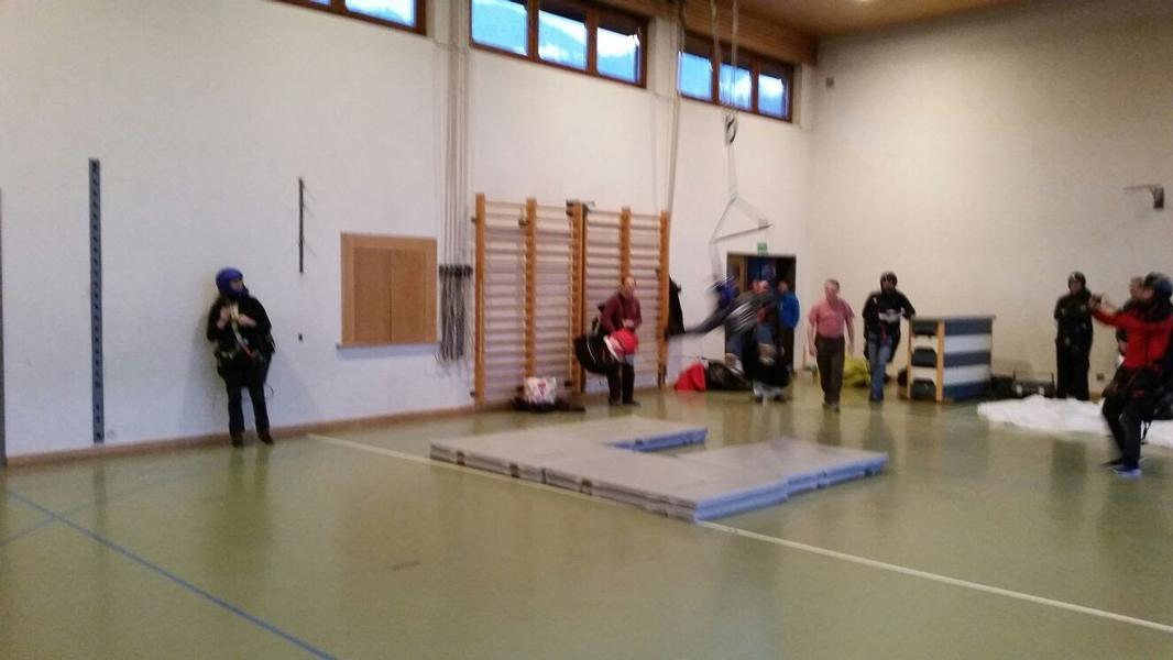 Danach wurde der Notschirm nicht nur aufgeschüttelt, sondern komplett aufgezogen und optisch geprüft. Als alle ihren Schirm geworfen hatten, wurden die Schirme über Nacht in der Halle aufgehängt. Die Messung der Luftfeuchtigkeit in der Turnhalle zeigte, dass die Bedingungen optimal waren.