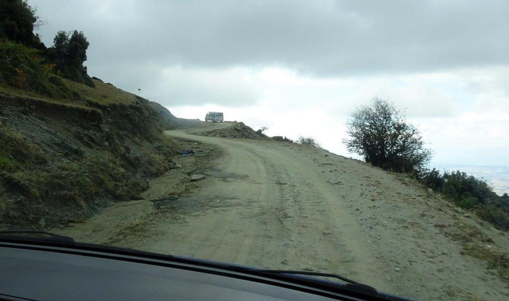 Irgendwo auf einer abgelegenen Strasse hat uns Louis ein mystisches Phänomen gezeigt. Mit einem Finger schob er unser Mietauto auf der Passstrasse „bergwärts“!? Hausi und ich untersuchten die „Magnetfelder auf der Strasse genauestens. Siehe Bilder. Von meiner logischen Erklärung dazu (das Gleiche gibt’s in Colima, Mexico) war er und die Übrigen nicht restlos überzeugt. Zuviel Erich von Däniken gelesen.